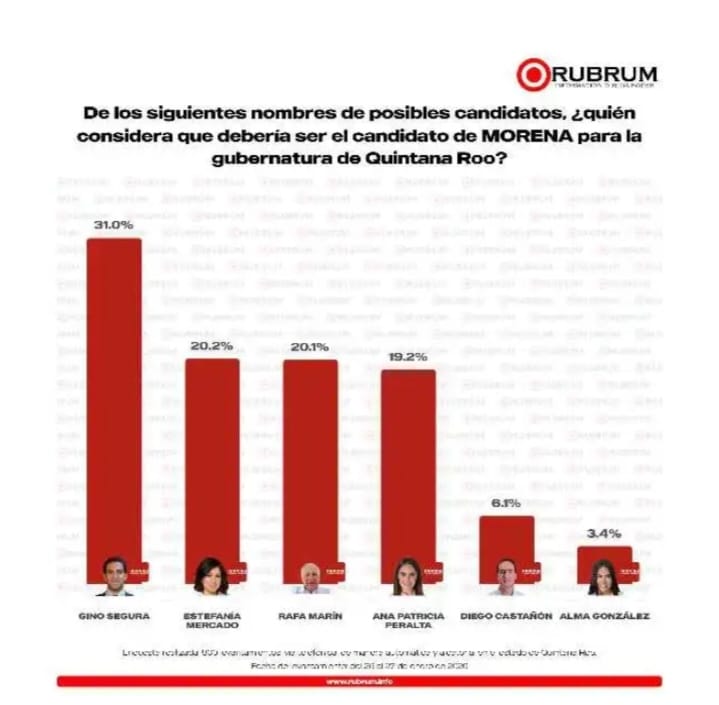 La encuesta de Rubrum, más que una fotografía estática, muestra una tendencia: Gino Segura encabeza el bloque masculino, mientras Estefanía Mercado se afianza como la mujer mejor evaluada, configurando desde ahora los dos polos internos que marcarán la conversación rumbo a 2027 en Quintana Roo.